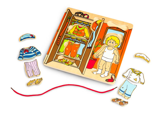 Up to 13 pieces of puzzles & 1 string allow 2 creative play functions : 1) play on-the-board by placing his clothing on top to match the uniforms. 2) play off-the-board by bringing the boy out and practice lacing to match his uniforms.