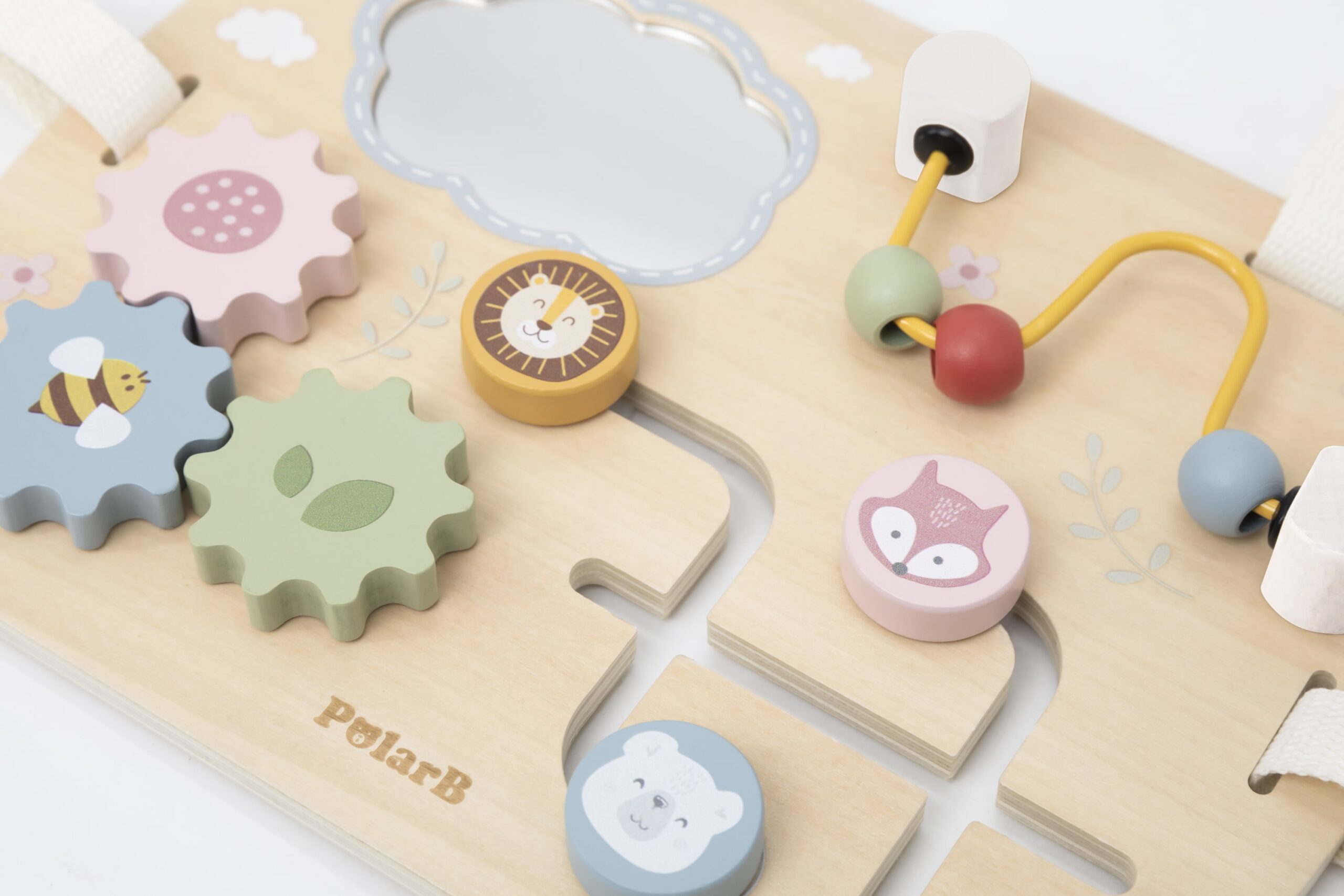 This baby board includes a mirror, a bead maze, gears, and a slider. It supports curiosity and sensory development while enhancing tactile and fine motor skills. Comes with 4 cotton Velcro tape for easy attachment to crib or stroller. It can also be played on a flat surface