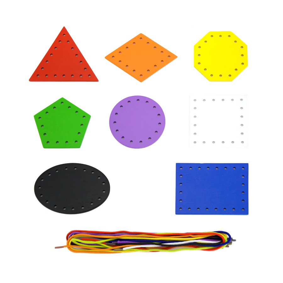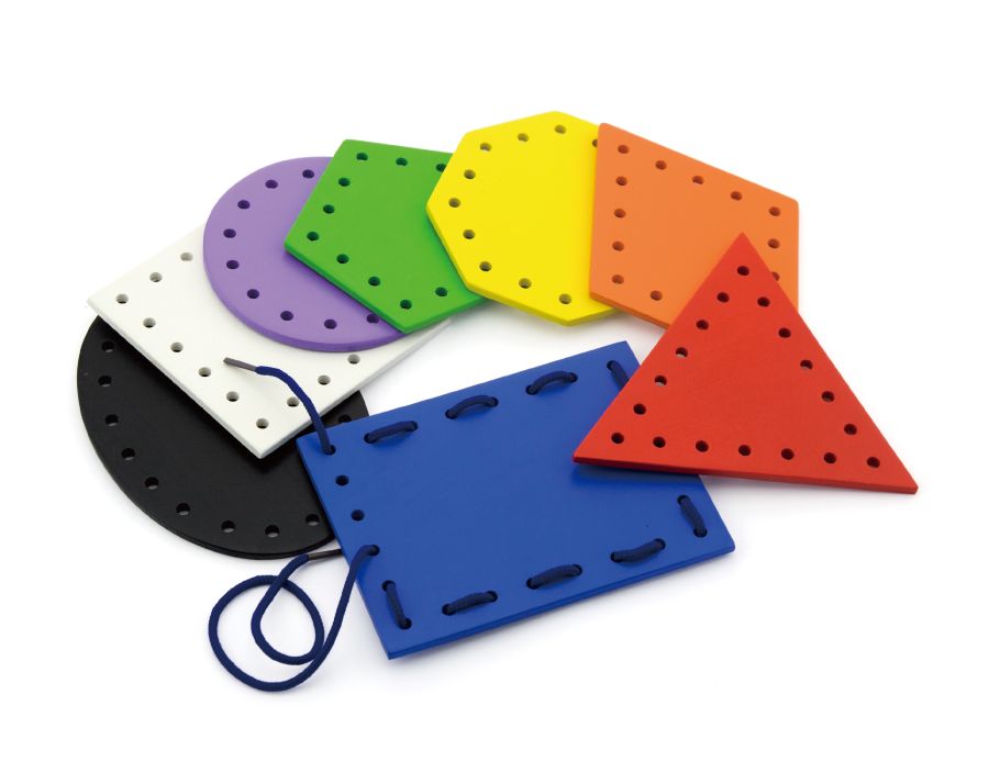 Eight different shapes in different colors with eight color-coordinated laces. It helps practicing for hand-eye coordination while threading tipped laces, no needle needed.